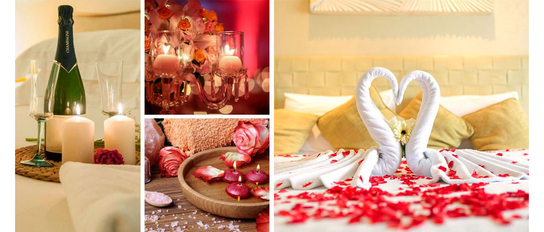 Suite Master ou Suite Luxo com montagem especial; Cesta de núpcias (espumante e mini-bolo de casamento); Arranjos de rosas ou pétalas espalhadas pelo quarto; Café da manhã servido no quarto; Check-in a partir das 14h; Late check-out até as 18h.